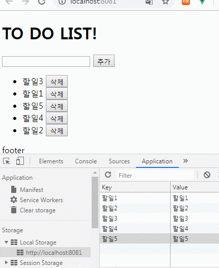 내가 저장한 할일 목록이 잘 출력됐다. 그런데 뭔가 불편하다. 할일을 추가하면 localStorage에는 저장이 되는데 화면에는 새로고침을 해야만 출력이 되고 있다.