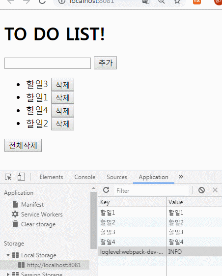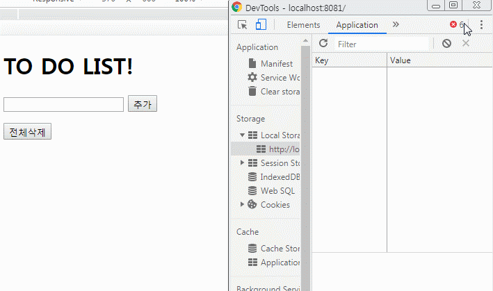 전체삭제 버튼을 누르면 localStorage의 모든 목록이 삭제된다. 화면의 할 일 목록은 새로고침을 해야만 삭제가 된다.