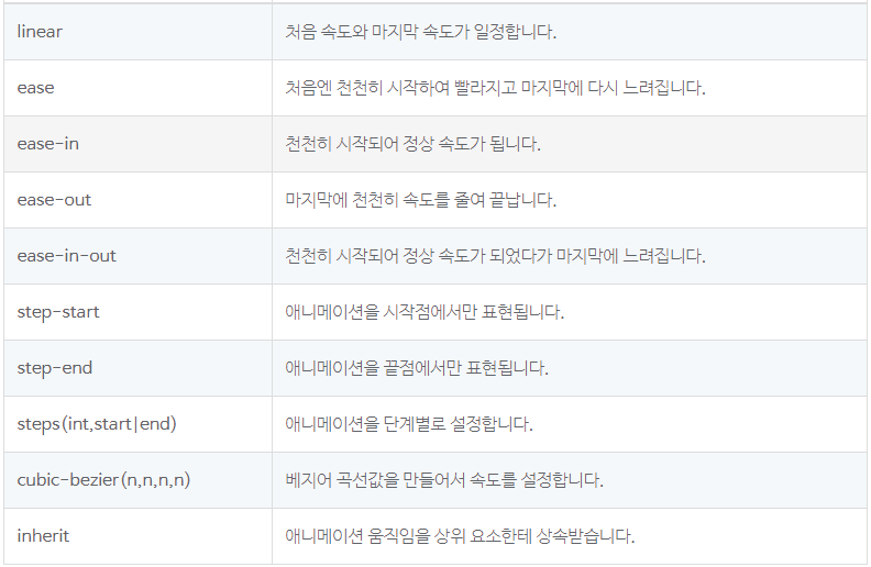 이는 animation-timing-function속성으로 해결이 가능하다. 이 속성은 easing과 같은데, linear값을 주어 애니메이션간 속도가 같게 만들어준다. 그 외 속성값은 아래 표를 참고하면 된다.