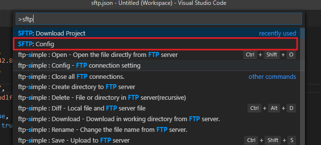 설치가 완료되면 키보드 "F1"를 눌러 뜨는 상단 검색창에 "sftp"라고 검색 후 뜨는 결과 중 "SFTP : config" 를 선택한다.