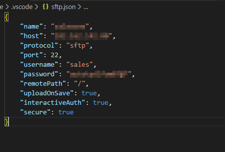 "SFTP : Config"를 선택하면 아래와 같이 "sftp.json"파일이 열린다. 해당 프로젝트의 서버정보를 입력해준다.