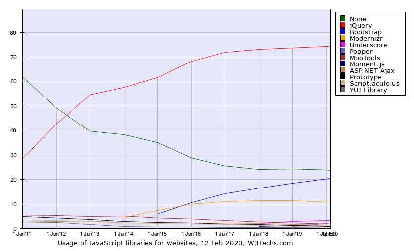 아무 라이브러리 없이 순수 자바스크립트(Pure Javascript)로 개발되는 웹사이트가 2020년 1월 기준으로 23.8%이고 Javascript 라이브러리를 사용하는 웹사이트 중 jQuery를 사용하는 웹사이트는 74.2%이다. 또, 직접 찾아본 최근 리뉴얼된 국내 대기업, 금융권, 공공 사이트들의 경우에도 모두 jQuery 라이브러리를 로드하여 사용하고 있었다. (물론 그 이유로는 웹사이트 제작은 웹에이전시에 외주로 맡긴 것도 있을테고, 웹사이트에 사용된 여러가지 플러그인이 jQuery에 의존하고 있을테지만)