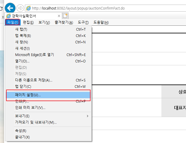 먼저 브라우저 메뉴 중 파일 > 페이지 설정을 선택한다. (브라우저 메뉴 자체가 안보인다면 Alt키를 누르면 메뉴가 노출된다)