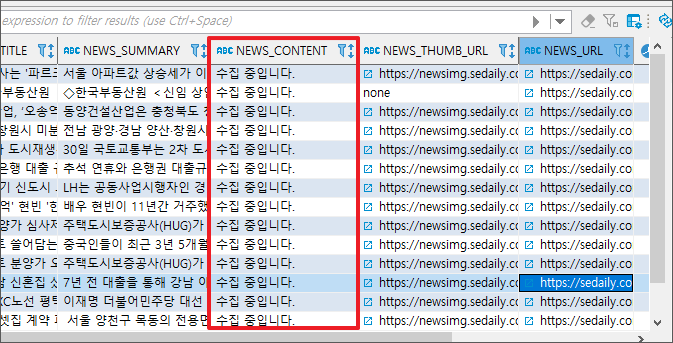 이것으로 서울경제 사이트에서 부동산 관련 3개 카테고리의 최신 뉴스를 수집하여 DB에 저장하는, "뉴스 수집"까지는 완료가 되었다. 앞으로 할 작업은 서울경제 사이트 외 언론사에서도 지금까지 작업한 것과 동일한 과정을 거쳐 뉴스를 수집하면 된다.