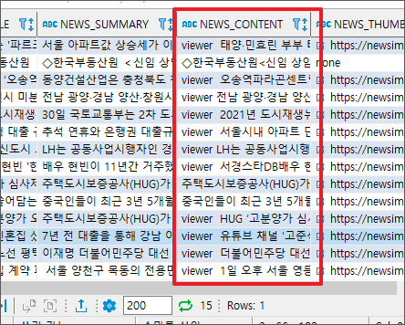 수집 후 확인해보니 기사마다 "viewer"이라는 키워드가 들어가있는데 이는 replace 메소드로 제거해줘야 할 것 같다.