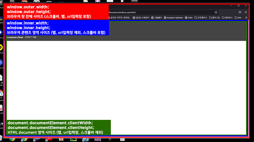 웹브라우저 창의 width와 height값을 가져올 수 있다. 브라우저의 탭, url입력창 등을 모두 포함한다.