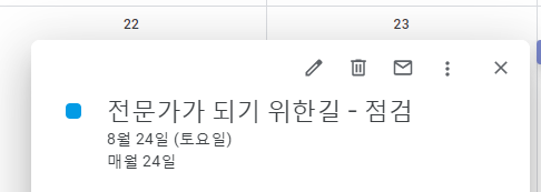 시간이 지나 이 글을 보면 둘 중 하나겠지, "아 그때 늦게라도 마음먹고 시작하길 잘했다", 또는 아무것도 하고 있지 않은 본인을 자책하거나. 글을 마무리 하려다 갑자기 든 생각인데 "만약 포기하고 아무 것도 안하고 있다면 이 글을 볼 다시 이유도 없지 않을까?" 란 생각이 들었다. 그래서 매일 쓰는 구글 캘린더에 매 30일마다 일정을 저장해두었다. 일정 제목은 "전문가가 되기 위한길 - 점검"